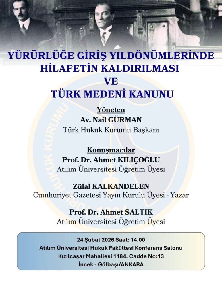 Yürürlüğe Giriş Yıldönümlerinde Hilafetin Kaldırılması ve Türk Medeni Kanunu konulu konferansımız 24.02.2026 günü saat 14.00’te Atılım Üniversitesi Hukuk Fakültesi Konferans Salonu’nda gerçekleştirilecektir. Tüm meslektaşlarımız davetlidir.